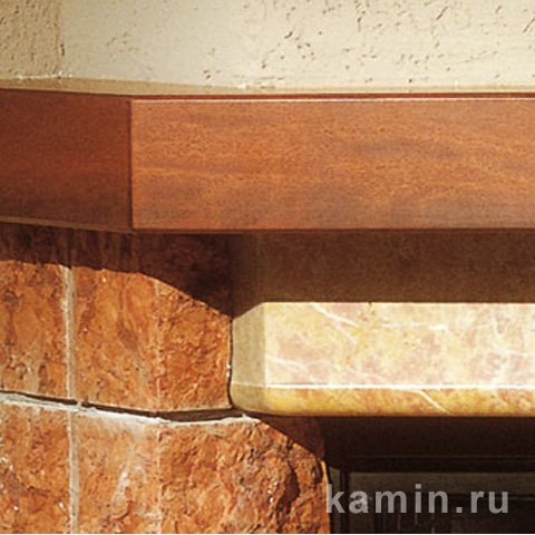 Угловая каминная облицовка из красного мрамора Asiago грубой обработки. Плита и фронтальный надтопочный архитрав из желтого мрамора Reale (сочетание полированного и полуполированного). Деревянная балка.